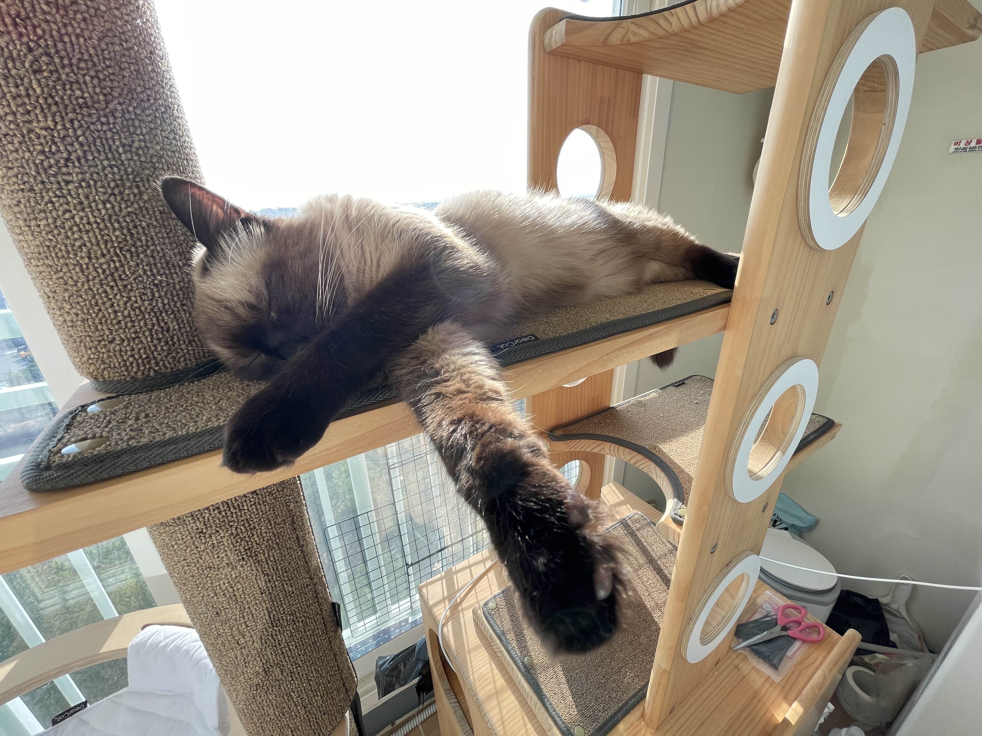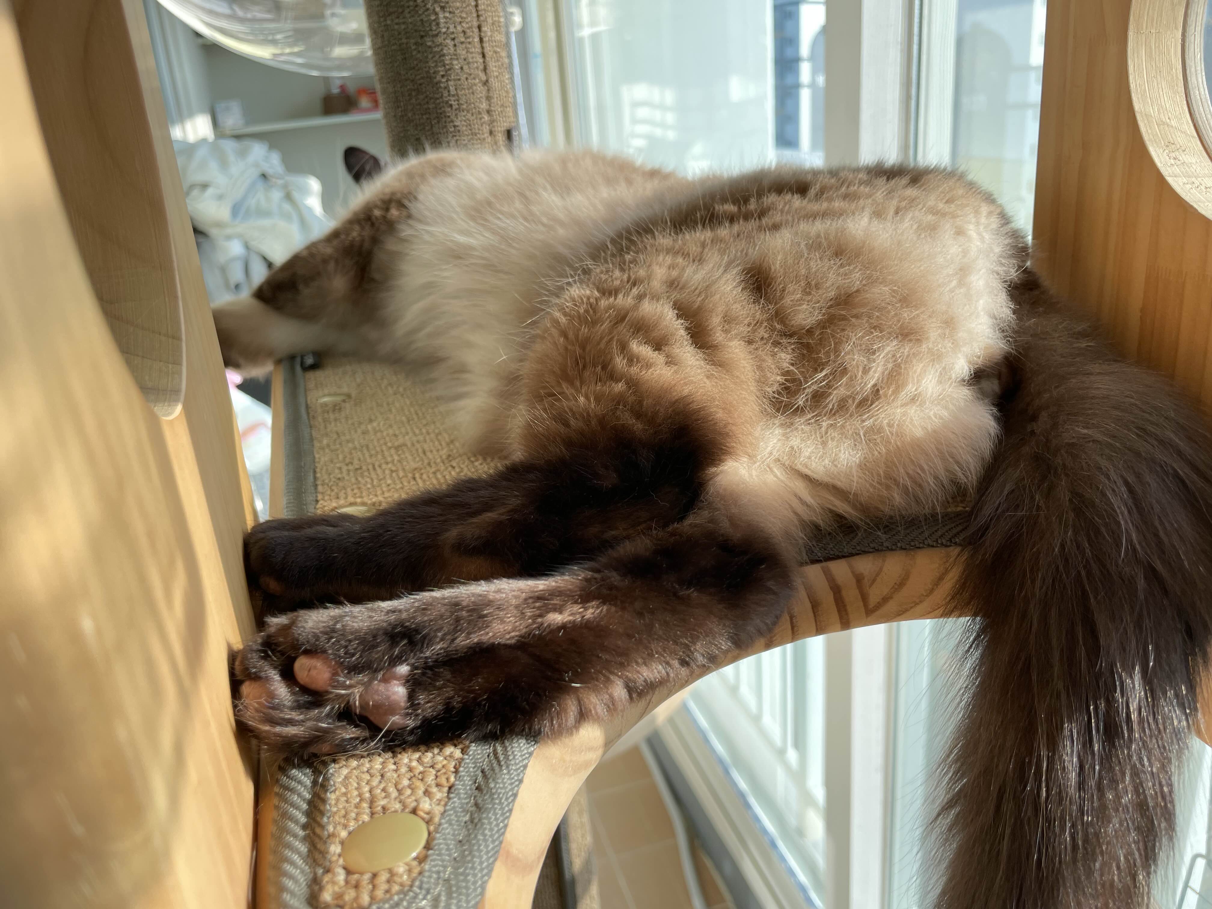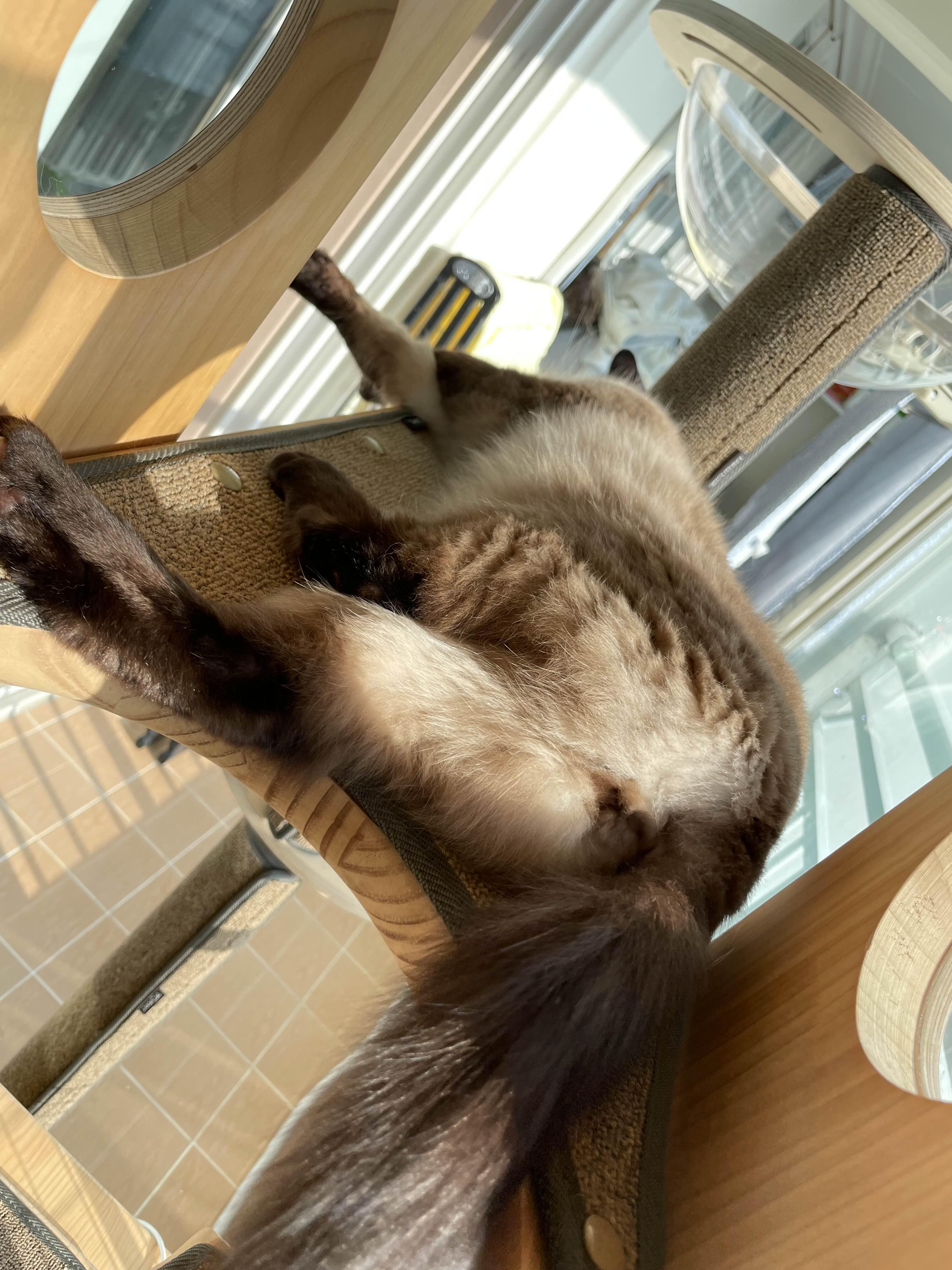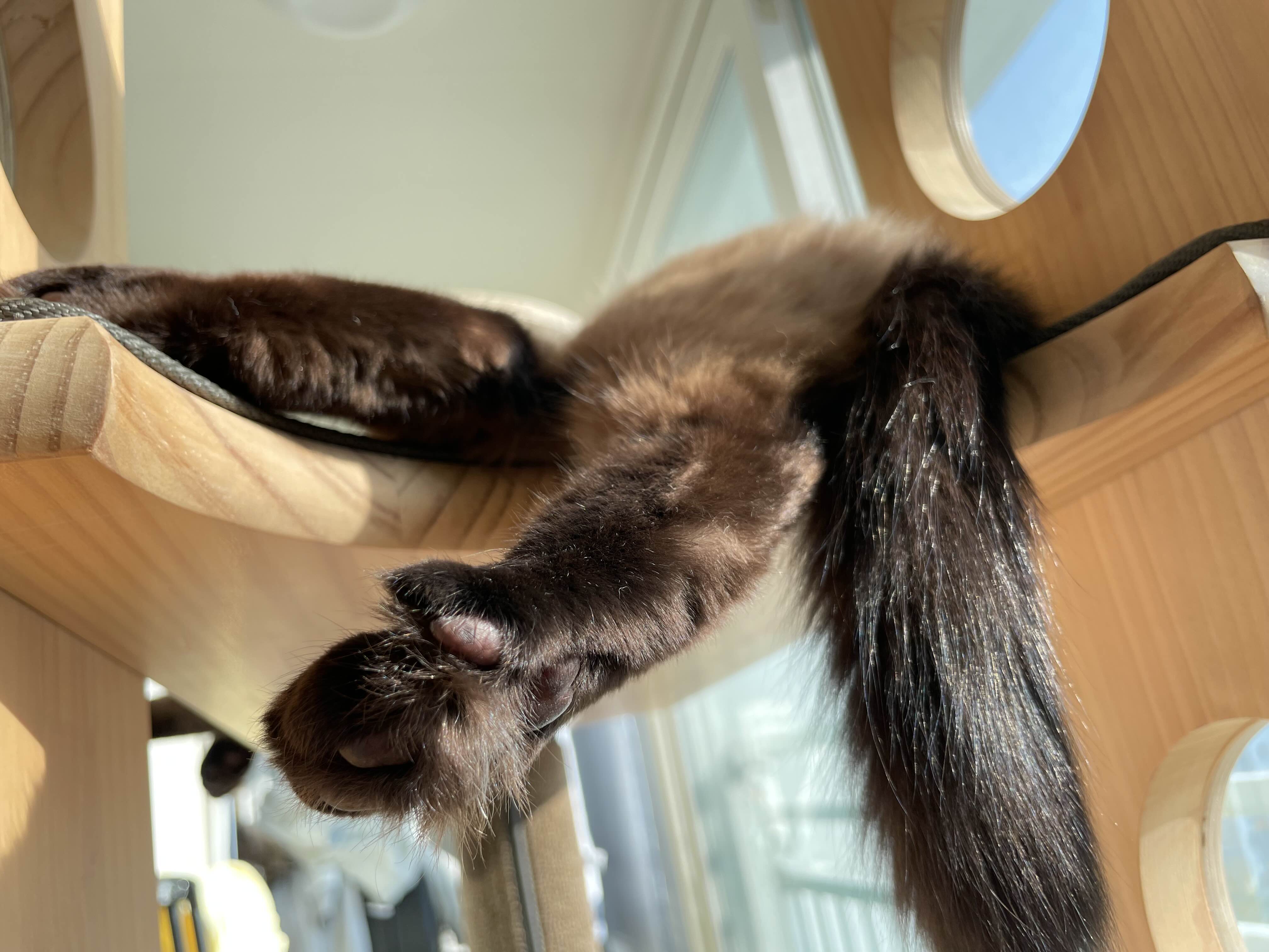 햇살이 비치는 캣타워에 매달려 있는 단추입니다.