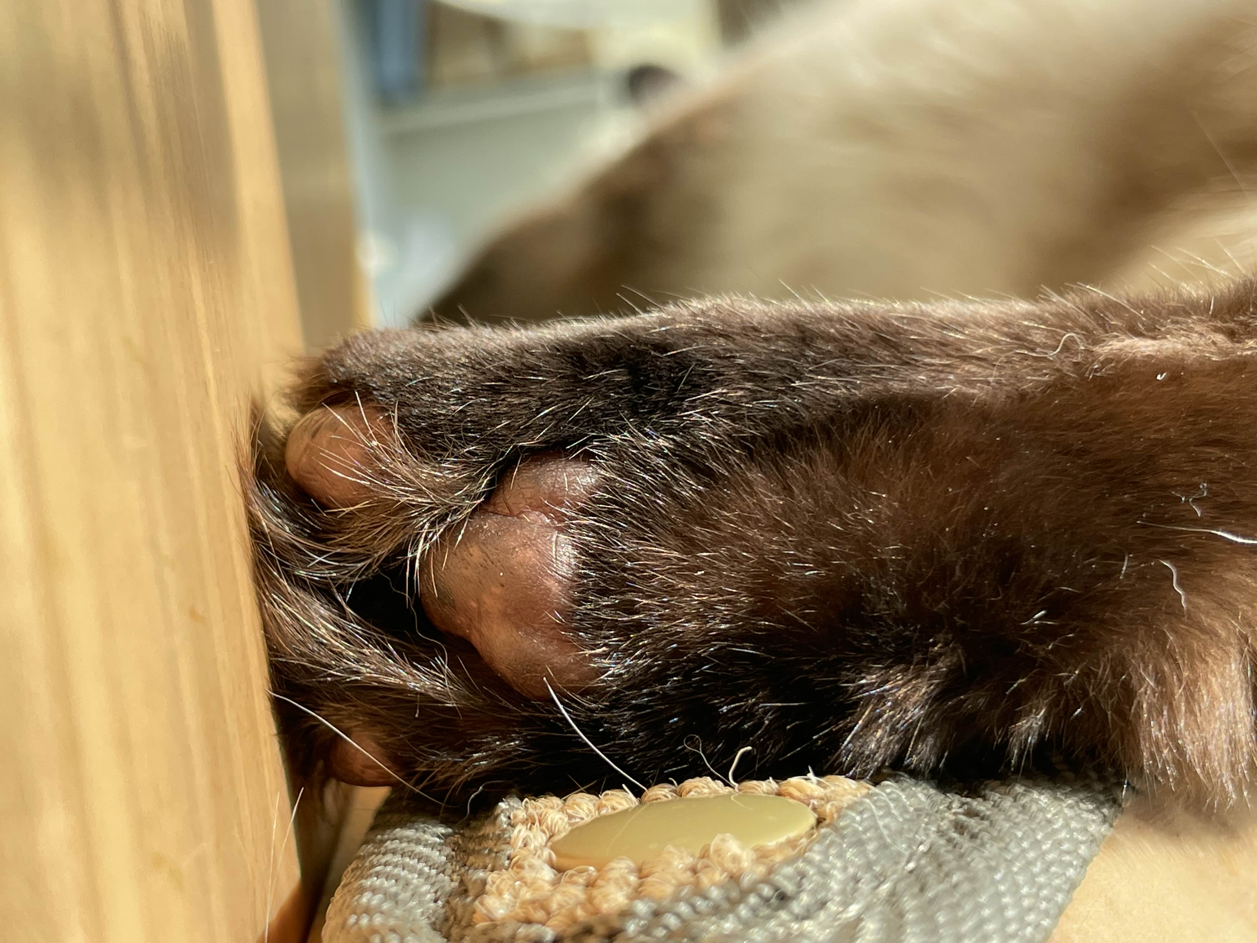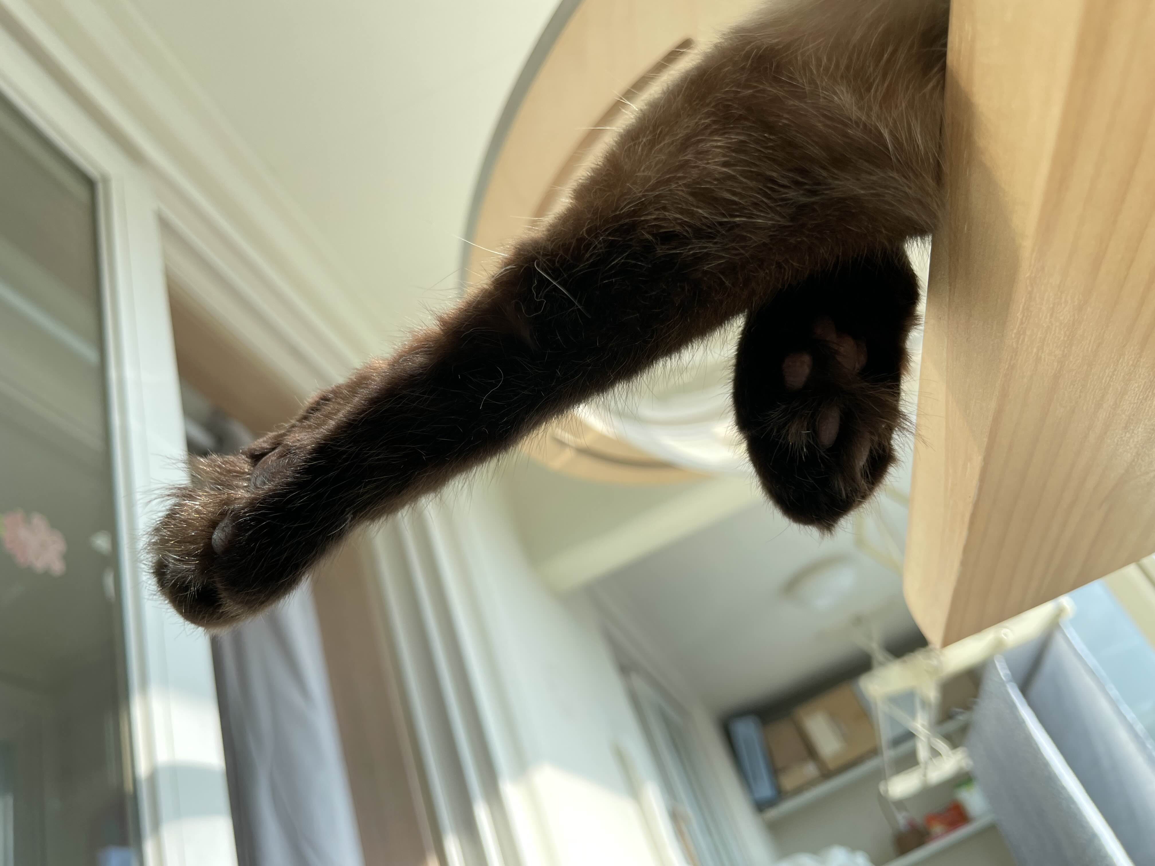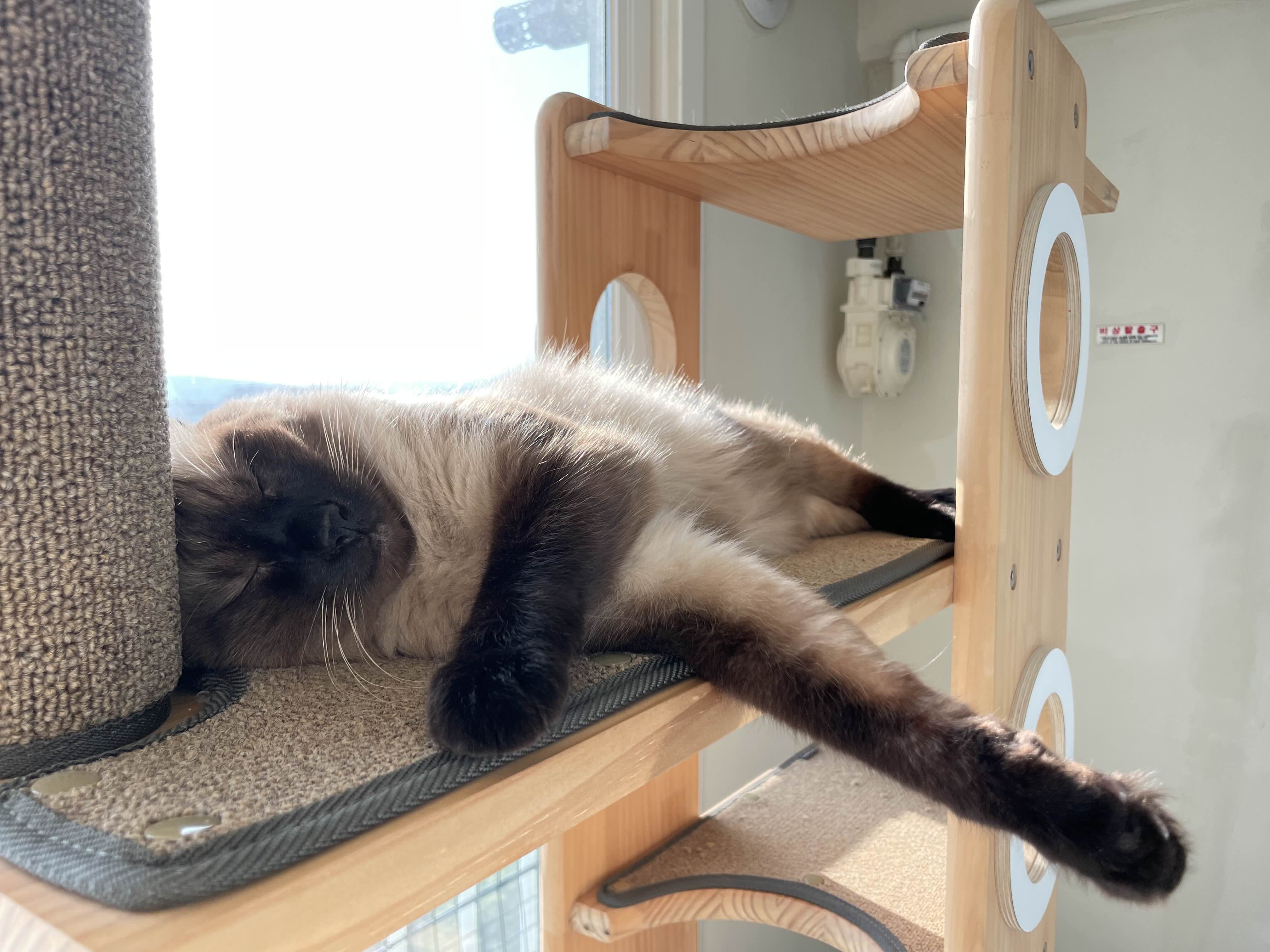 햇살이 비치는 캣타워에 매달려 있는 단추입니다.