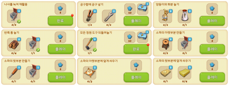 영역 3에는 도구 상자와 정원 도구 반환 작업이 있습니다. 저번 포스팅에서도 말씀드렸듯이 리워드로 받은 툴을 합체하면 바로 완성이 되겠죠?