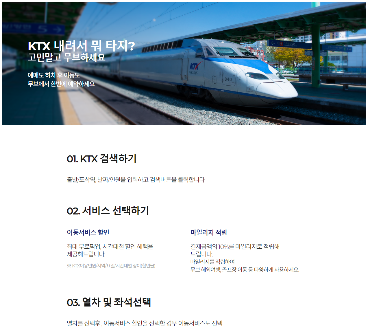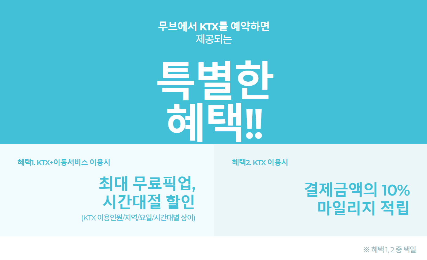 KTX와 연계된 무브택시 할인율은 이용인원/지역/요일/시간대에 따라 상이할 수 있으며, 무브비즈니스, 공항픽업, 무료 여행 서비스, 무료 KTX + 무브 그린카 혜택 또는 50% 할인 쿠폰. 편안한 여행이 되실거에요